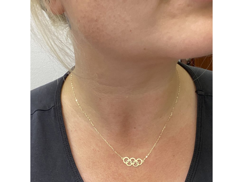 Tento elegantní náhrdelník s přívěskem ve tvaru olympijských kruhů je inspirován symbolem jednoty, síly a sportovního ducha. Precizně ručně vyrobený ze žlutého zlata, kombinuje nadčasovou eleganci s moderním designem. Ručně vyrobeno.