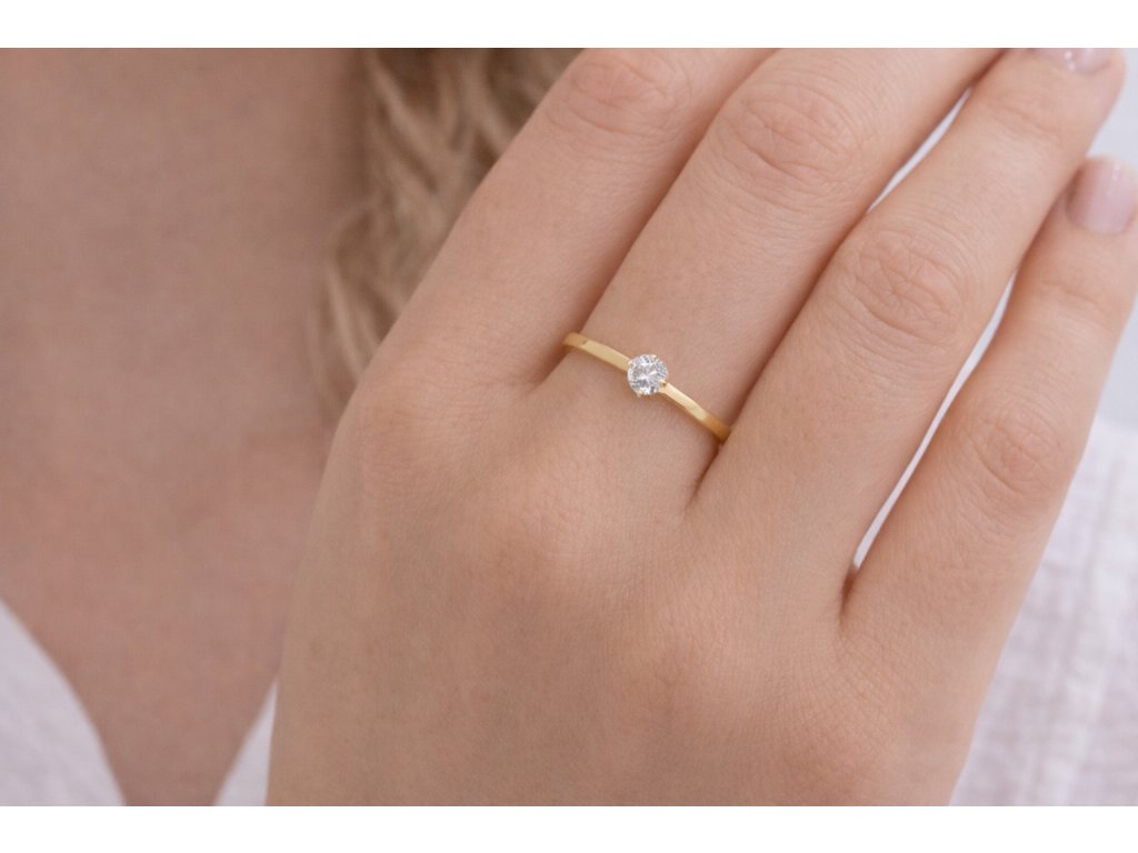 Jemný, nadčasový a dokonale elegantní. Tento prsten ze žlutého zlata je osazen briliantově broušeným diamantem, který je uchycen klasickými čtyřmi krapnami. Díky tomuto uchycení je kámen maximálně otevřen světlu a krásně vynikne jeho třpyt i brilance.