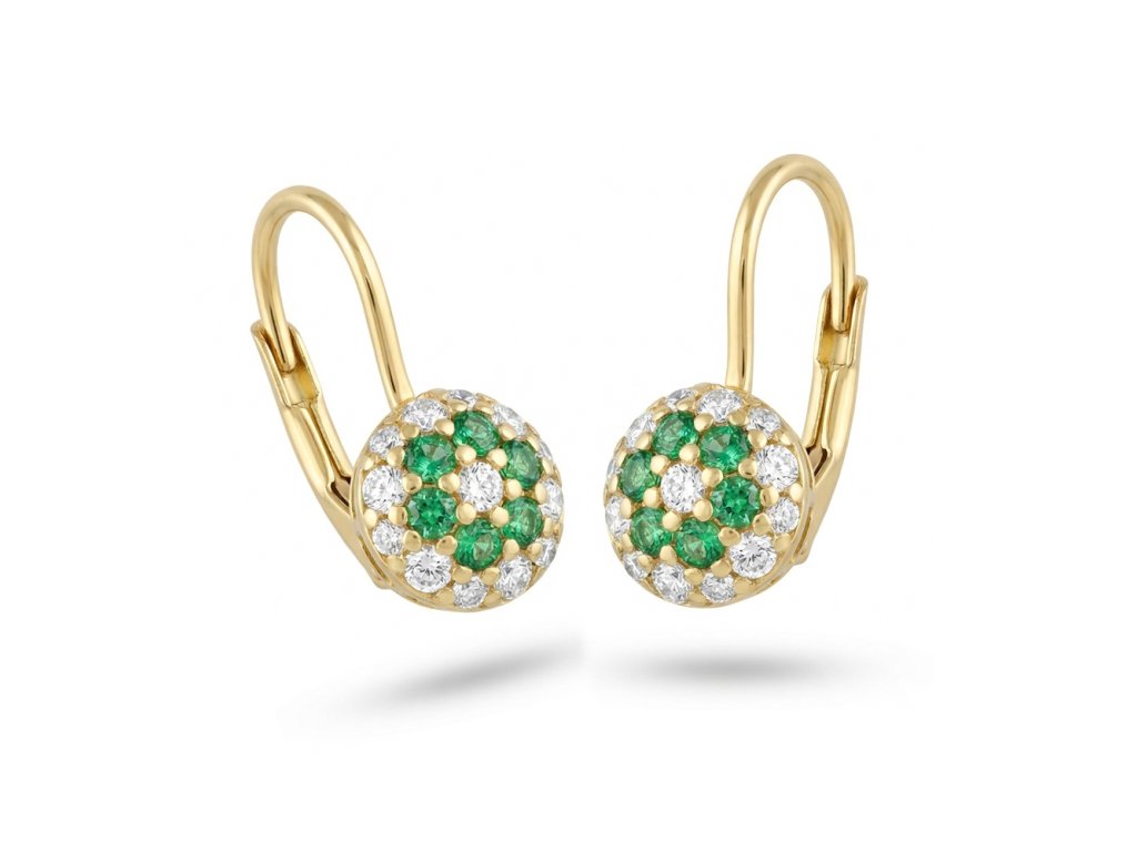 Tyto náušnice ze žlutého zlata v sobě spojují jemnost kytičky s elegancí zářivých zirkonů. Středový motiv tvoří zelené kameny obklopené čirými zirkony, které připomínají rozkvetlou louku.