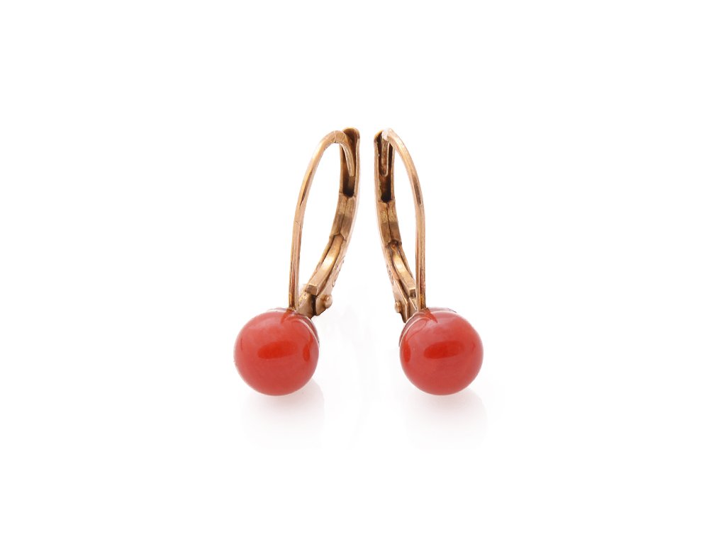 Krásné a jednoduché náušnice zdobené sytě červeným syntetickým korálem. Náušnice jsou praktické a vhodné na běžné nošení. Vyrobené jsou ze žlutého zlata ryzosti 585/1000-14karátů.
