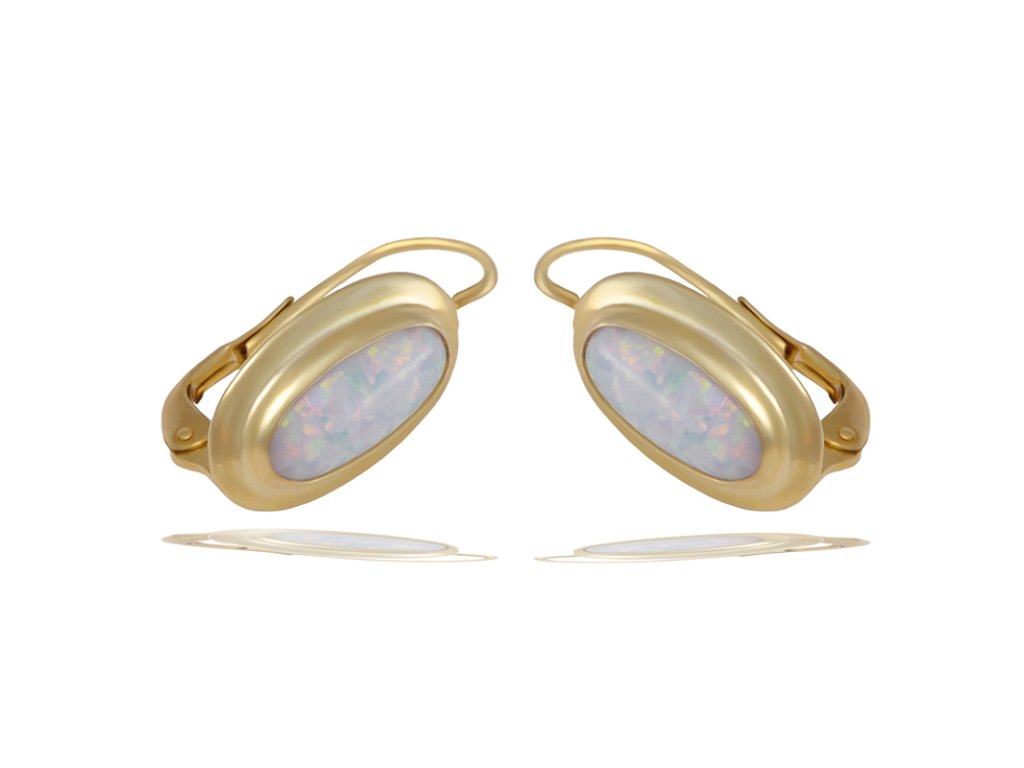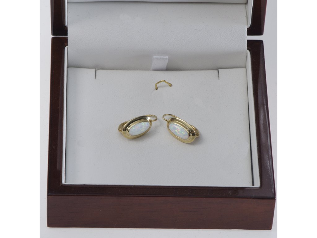 Luxusní dámské náušnice se syntetickým opálem ve světlé barvě s krásným třpytem. Náušnice jsou vyrobeny ze žlutého zlata ryzosti 585/1000 do lesklého provedení.