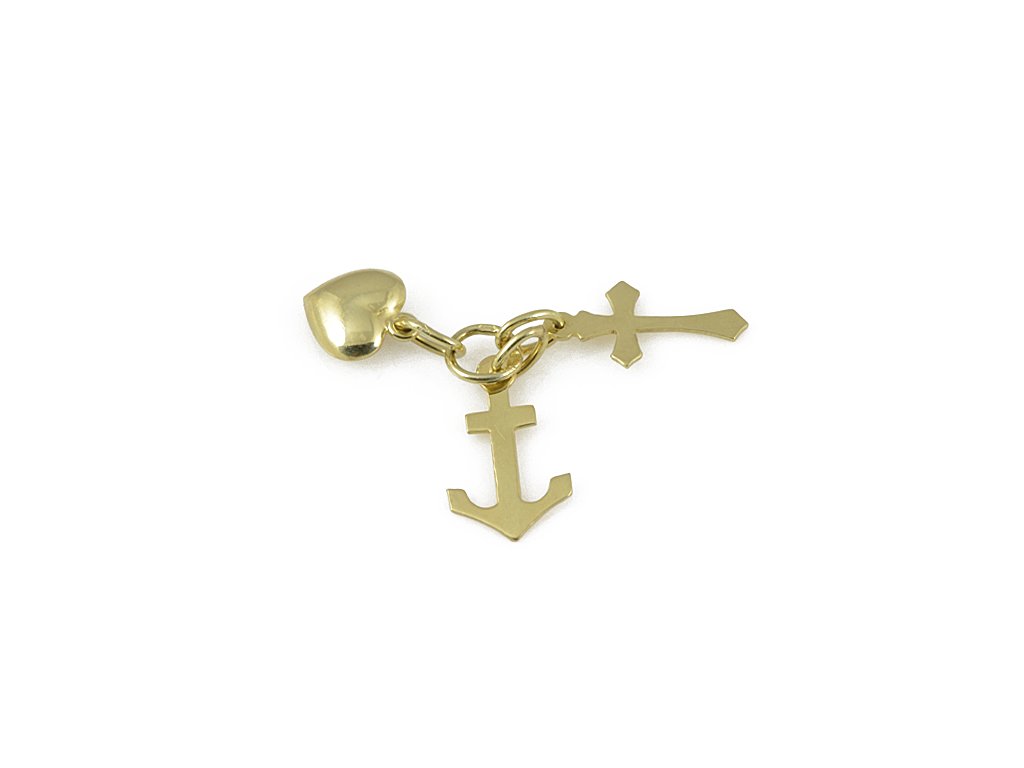 Zlatý přívěsek se srdcem, kotvičkou a křížkem, které značí lásku, naději a víru. Přívěsek je vyroben vyroben ze zlata ryzosti 585/1000. Tento přívěsek je velmi jedinečný!